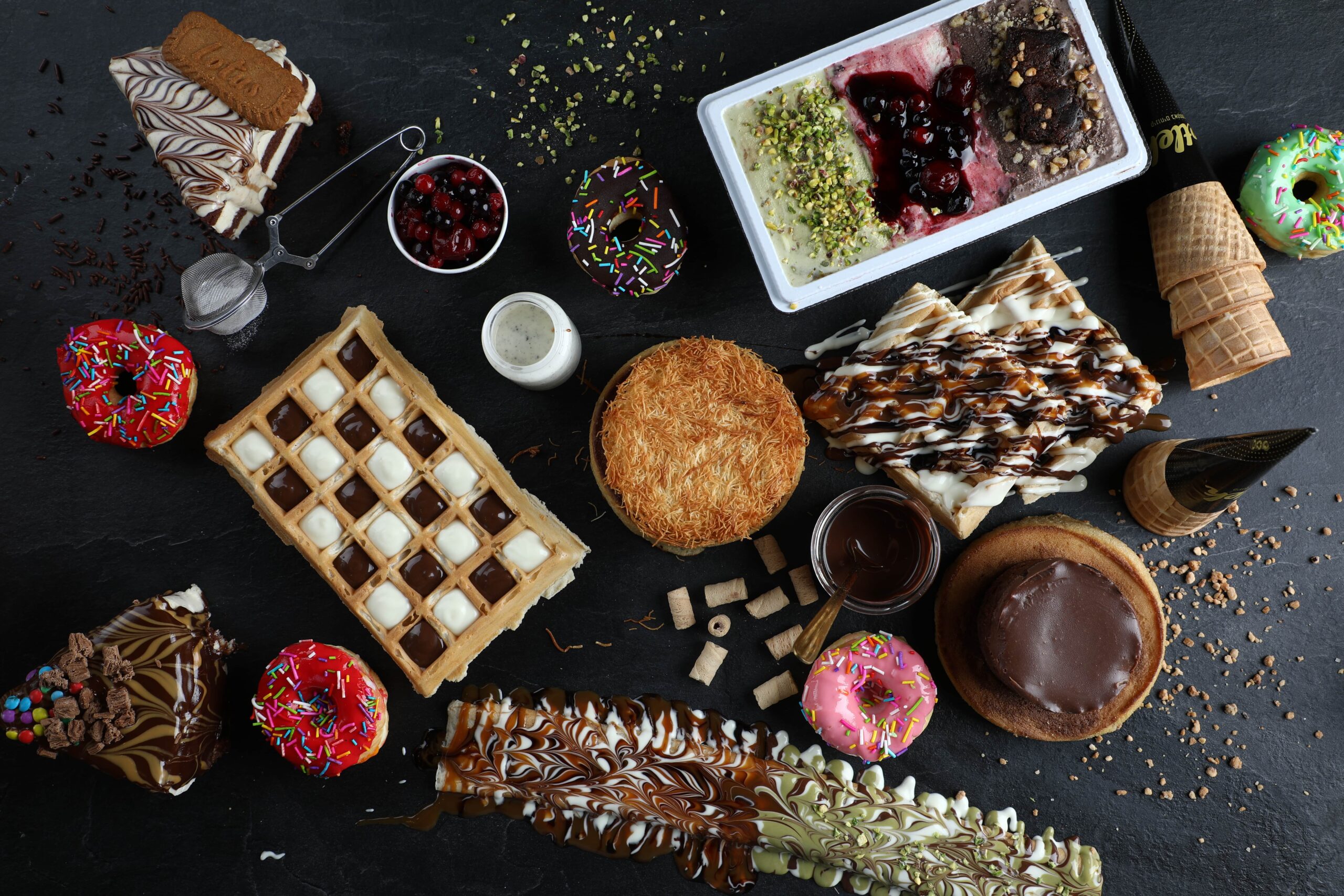 ארבעה פנקייקים, ארבעה וופלים, 2 פרוסות עוגת קרוסלה, סופלה, כנאפה בלווי רוטב חום אגוזים ולבן וחצי ליטר גלידה